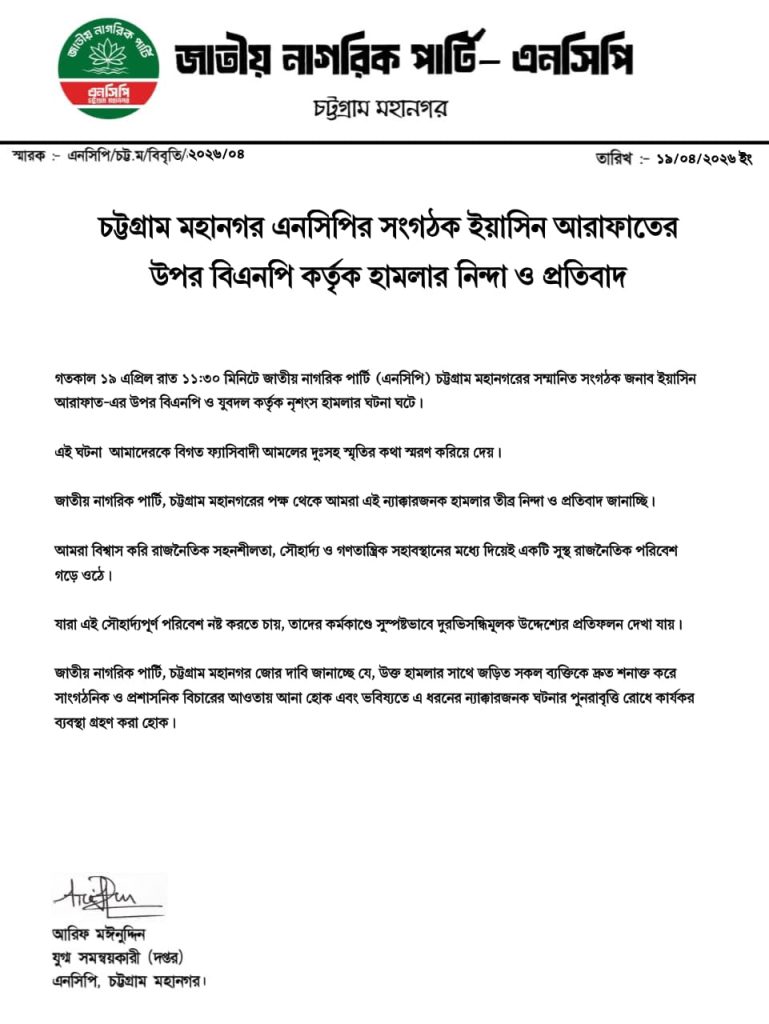 চট্টগ্রামে এনসিপির সংগঠক ইয়াসিন আরাফাতের উপর হামলার নিন্দা ও প্রতিবাদ