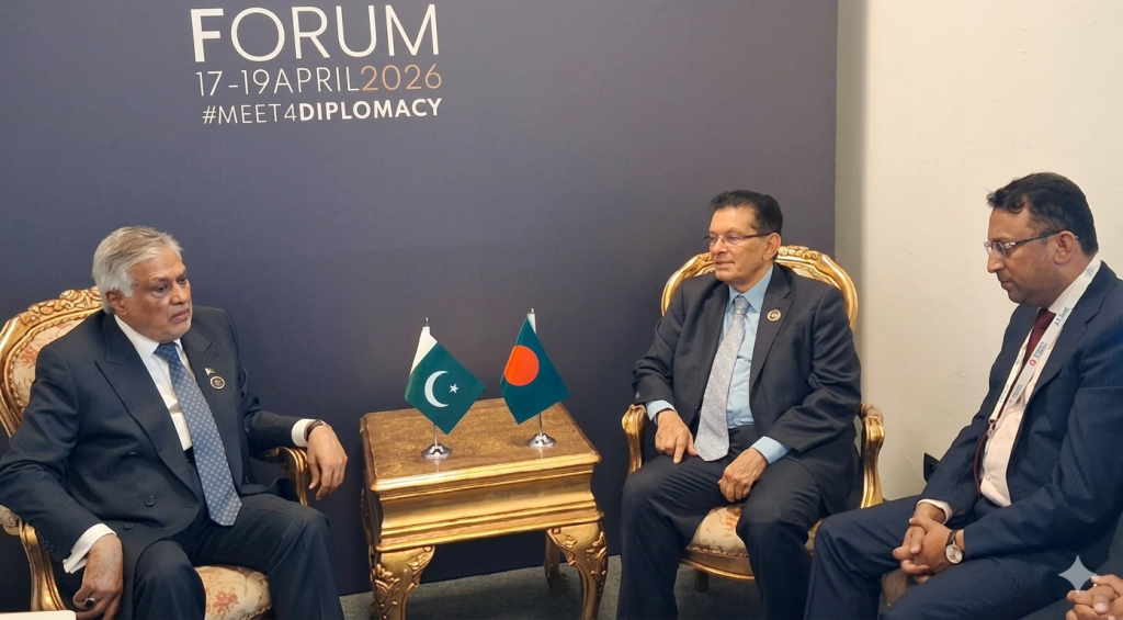 তুরস্কে অনুষ্ঠিত এক দ্বিপাক্ষিক বৈঠকে মধ্যপ্রাচ্যের সংঘাত নিরসনে পাকিস্তানের কার্যকর কূটনৈতিক ভূমিকার প্রশংসা করে দেশটির পররাষ্ট্রমন্ত্রী ইসহাক দারকে ধন্যবাদ জানিয়েছেন বাংলাদেশের পররাষ্ট্রমন্ত্রী ড. খলিলুর রহমান। শনিবার (১৮ এপ্রিল) পররাষ্ট্র মন্ত্রণালয় জানায়, তুরস্কের ‘আন্তালিয়া ডিপ্লোমেসি ফোরাম’-এর সাইডলাইনে এই বৈঠকটি অনুষ্ঠিত হয়।